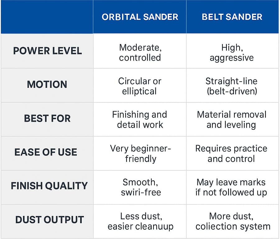 Choosing between an orbital sander and a belt sander isn’t about being “right” or “wrong” — it’s about knowing what your project needs and matching the tool to the task.