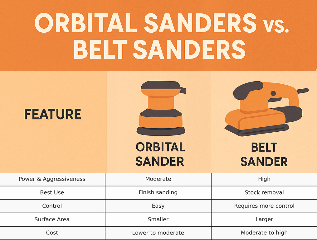Belt sanders are great for removing lots of material fast. Orbital sanders give a more gentle and refined surface, and are best for finishing work.