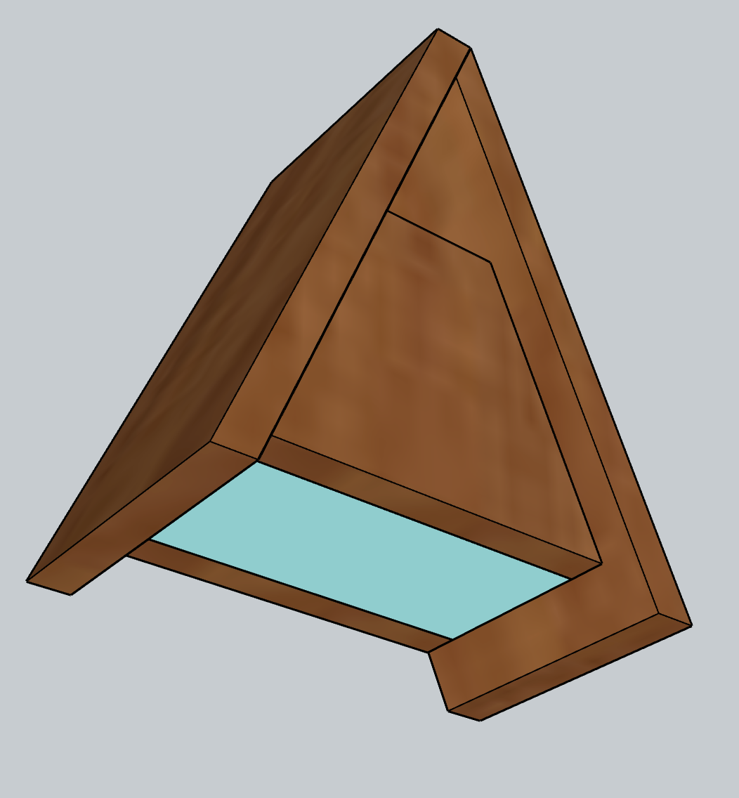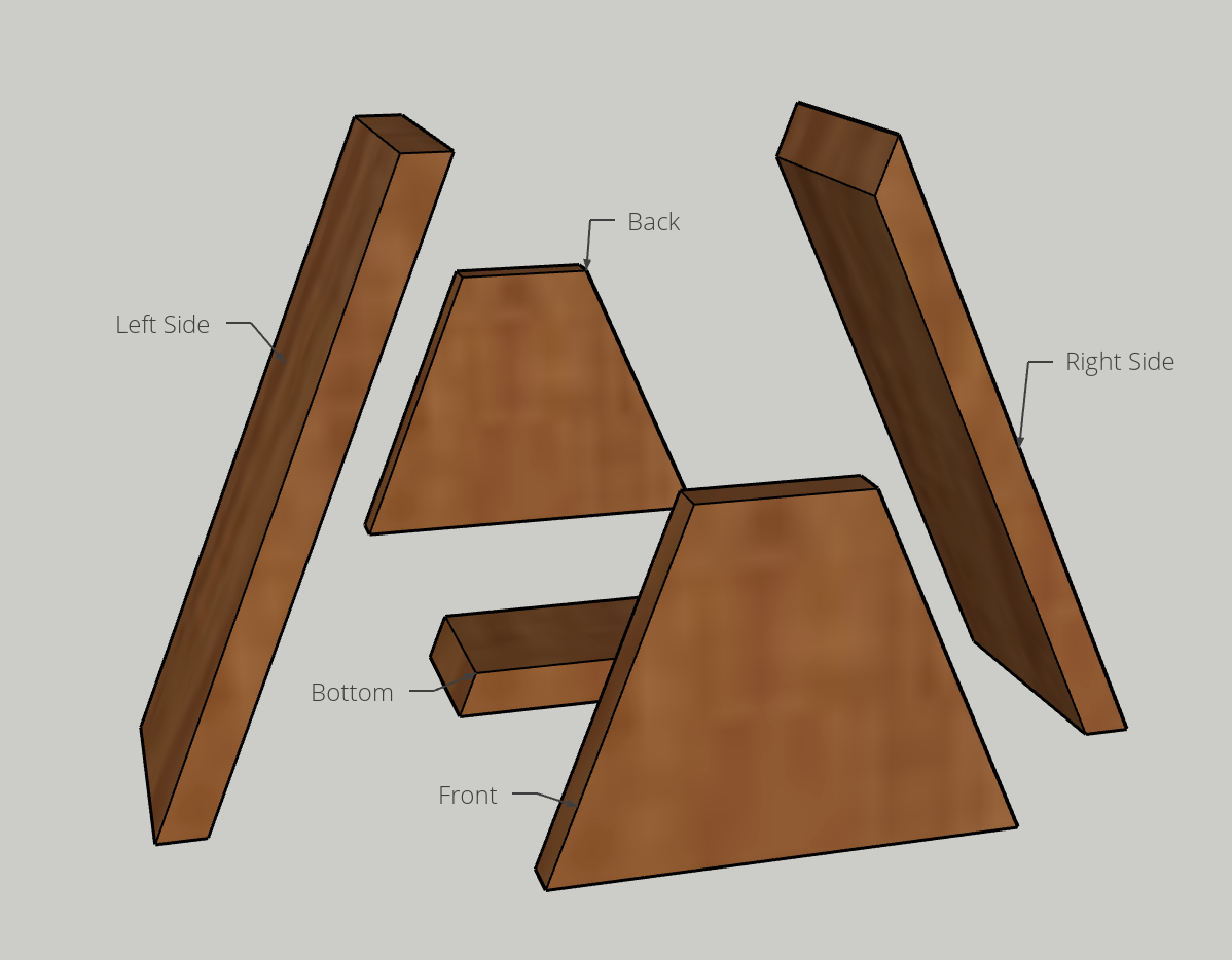 Using pocket hole screws (but no wood glue if you want to be able to clean out the birdhouse later), attach the Bottom into the two Sides, between the Front and Back.