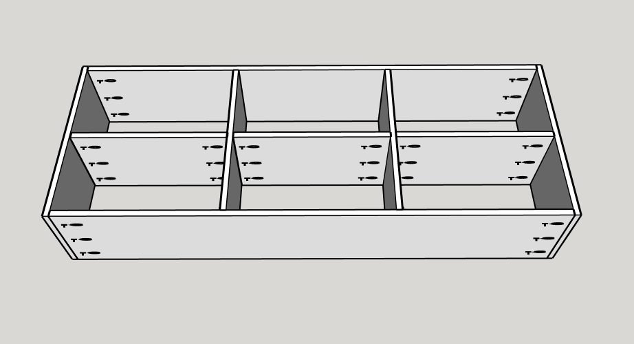 Screw the vertical shelves into top and bottom of the table using 1 1/4" screws and wood glue.