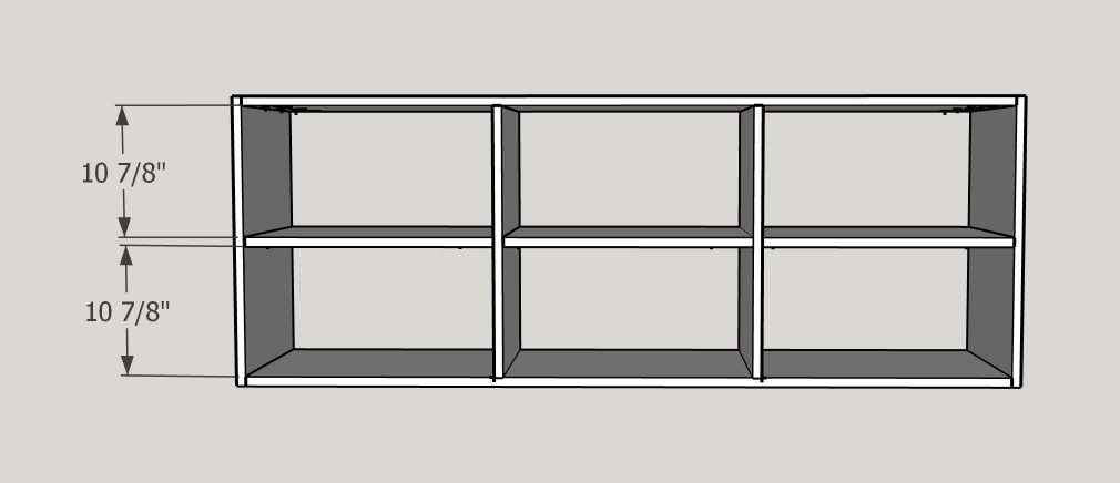 Refer to the image for equal distance spacing between the vertical shelves and the top and bottom of the table.