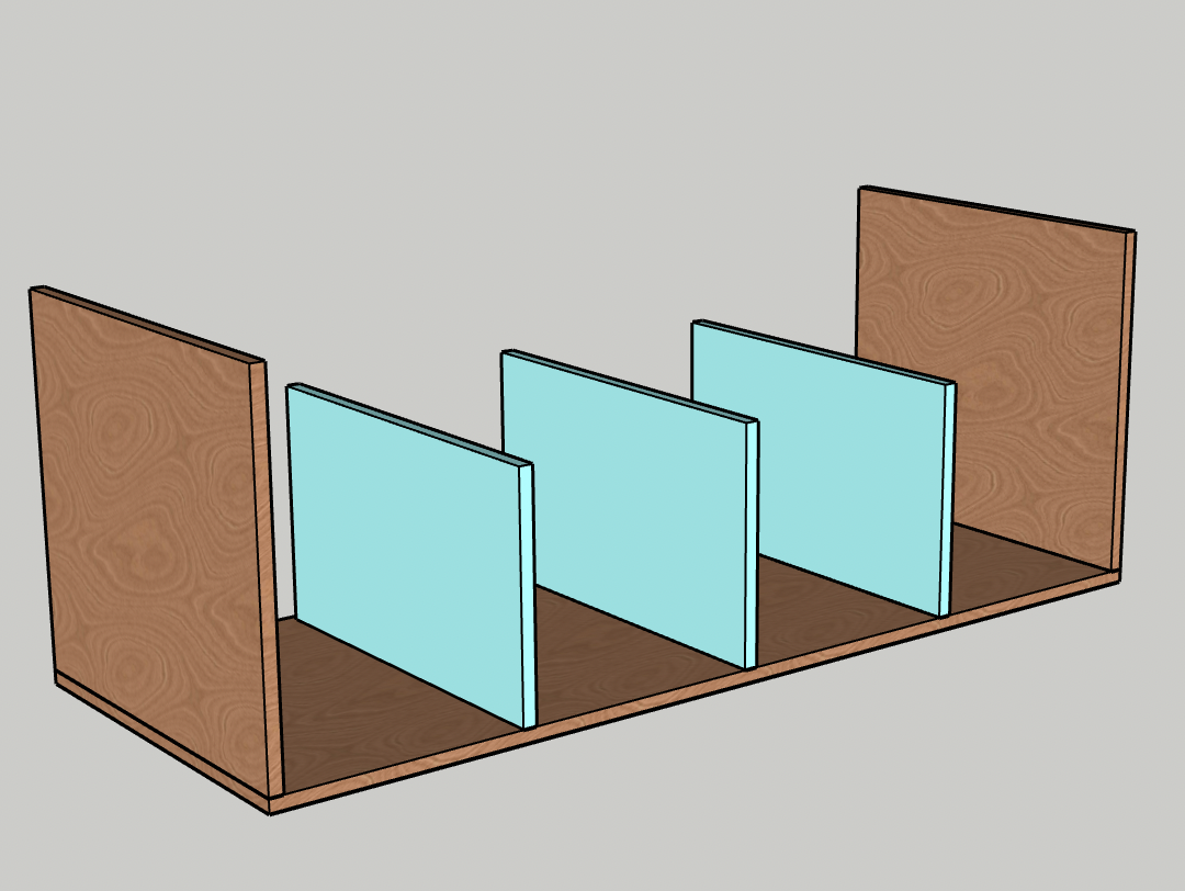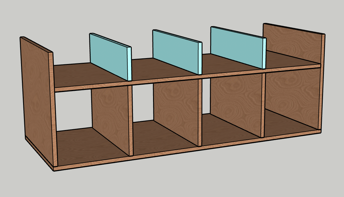 Using wood glue and pocket hole screws, attach the three Big Dividers to the Bottom with equal 13" spacing between them and aligned with the front edge of the Bottom.