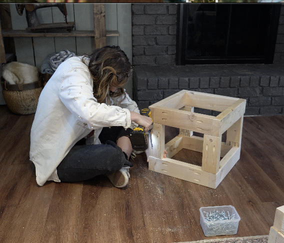 Take your four 8" pieces and use pocket hole screws to connect the two square frames — one at each corner to create a cube.