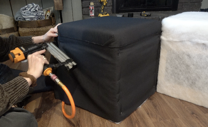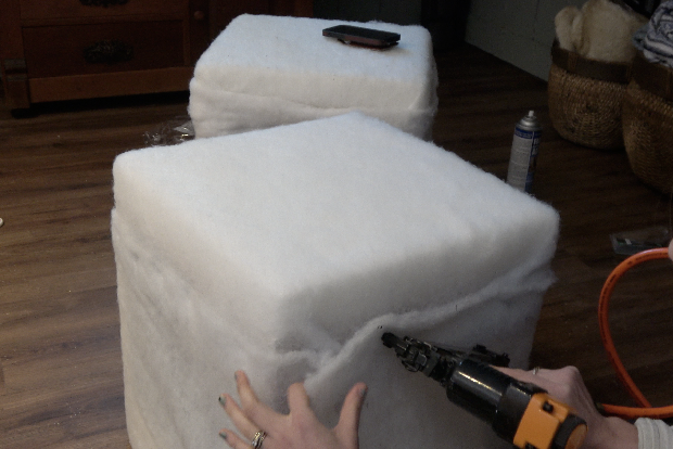 Staple a piece of batting over the foam top, smoothing it out as you go. Then wrap batting around the sides and staple it in to the corner and at the bottom.