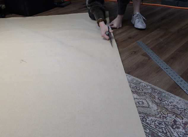 To prevent any gaps in the weave from showing the batting, staple a layer of black cotton fabric over the top and wrap a piece around the sides stapling at one of the corners. This gives a cleaner finish.