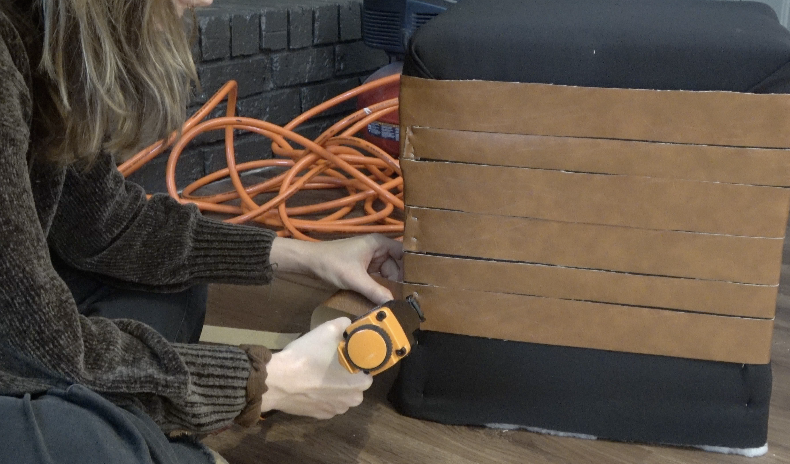 Start with the horizontal strips. Staple one end to a corner, wrap it around the ottoman, and staple again at the same corner. Alternate your stapling pattern at the corner to help hide staples later during weaving.
