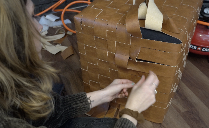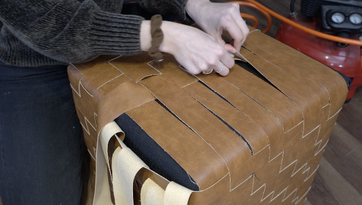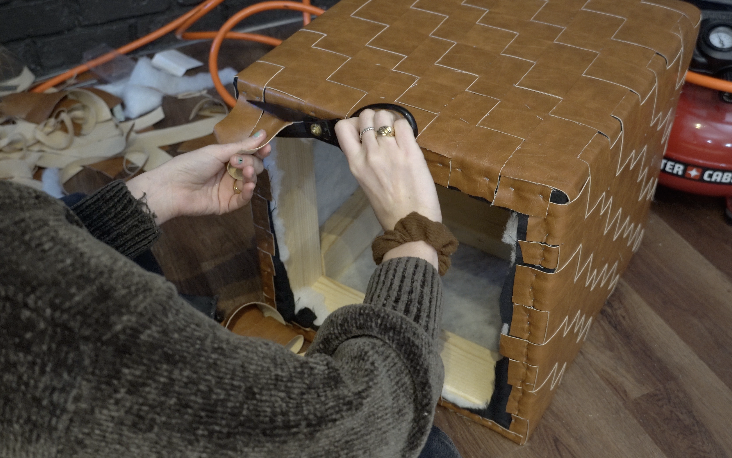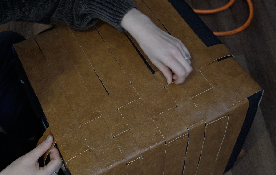 Cut pleather (or other non-fraying fabric) into strips between 1"–2" wide. Make sure they’re long enough to wrap around the sides and go up and over the top of the ottoman. Take your time to cut straight lines for a clean weave.