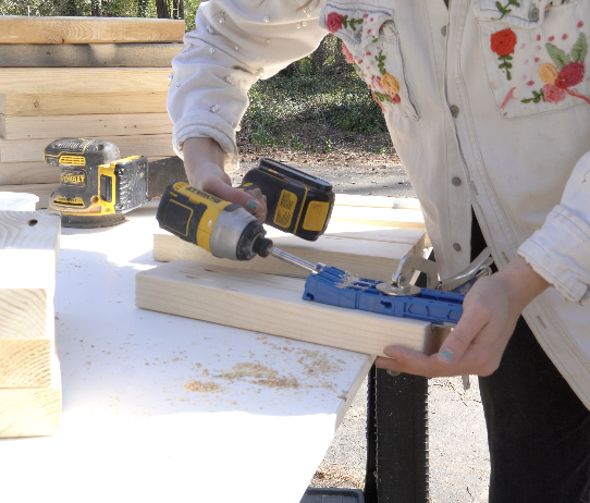 Drill two pocket holes on each end of the 13" pieces and each end of the 8" pieces. Sand pieces as you drill pocket holes.